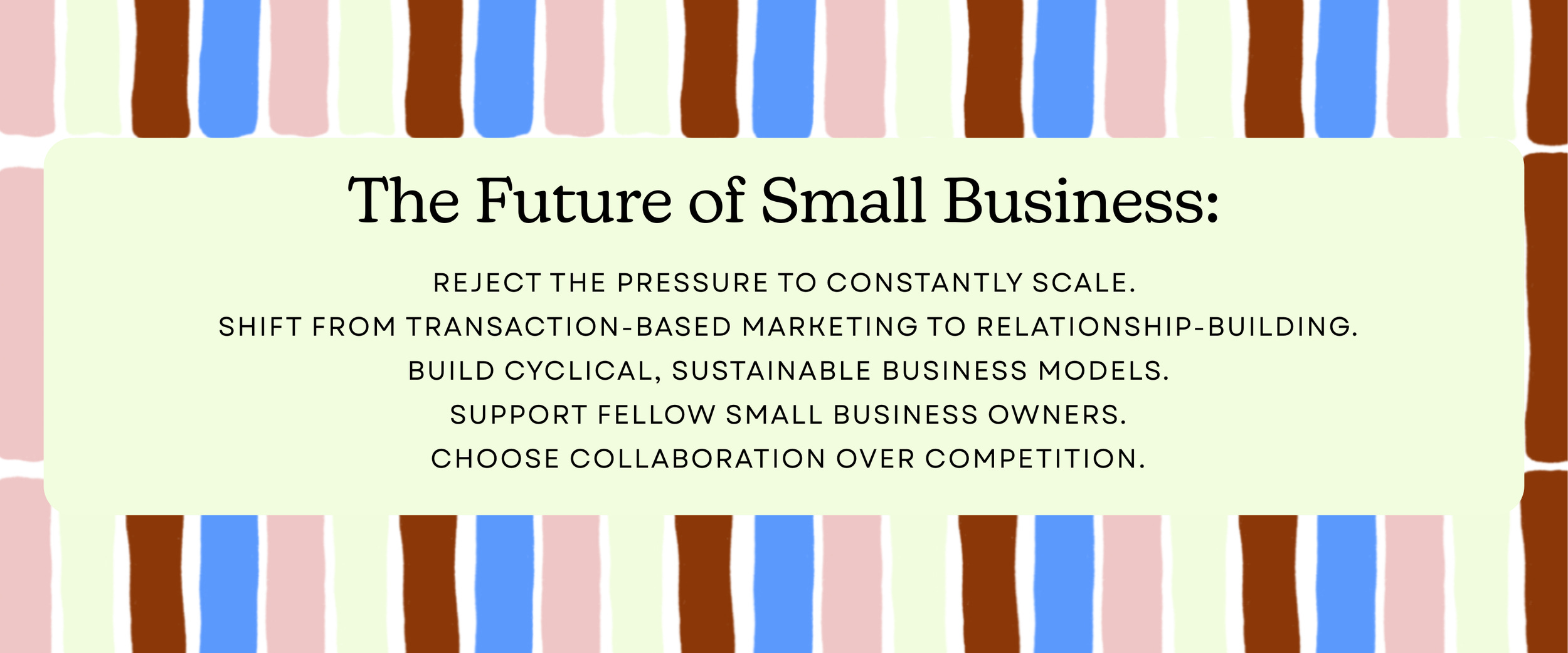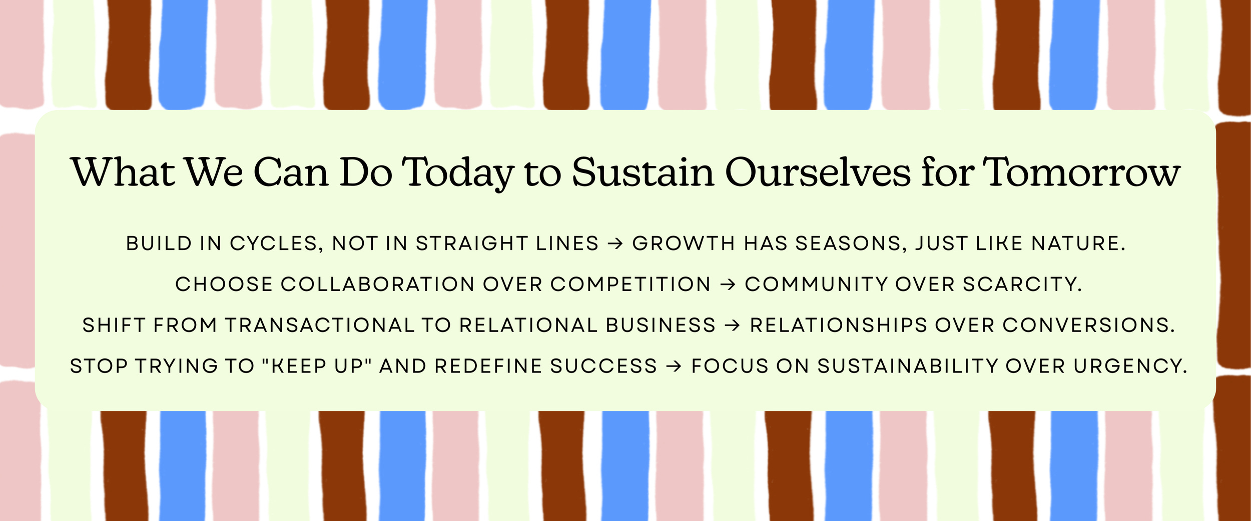 If we want to sustain ourselves for tomorrow, we must build businesses that reflect a different set of values: reciprocity, community care, collaboration, and long-term sustainability.